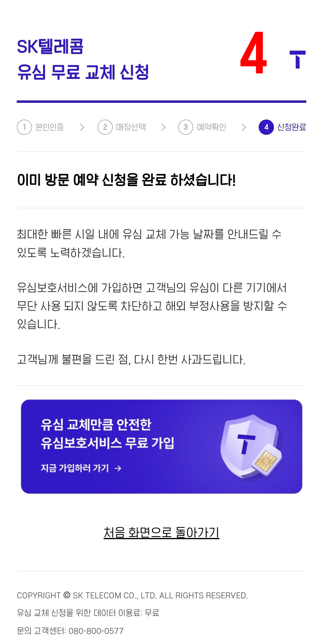 ※ 보안을 위해 대리점에서 직접 방문하여 진행해야 하며, 비대면 교체는 불가합니다. 또한, 4월 19일(토) 이후 신규 가입자는 무료 교체 대상에서 제외되니 꼭 참고하세요.