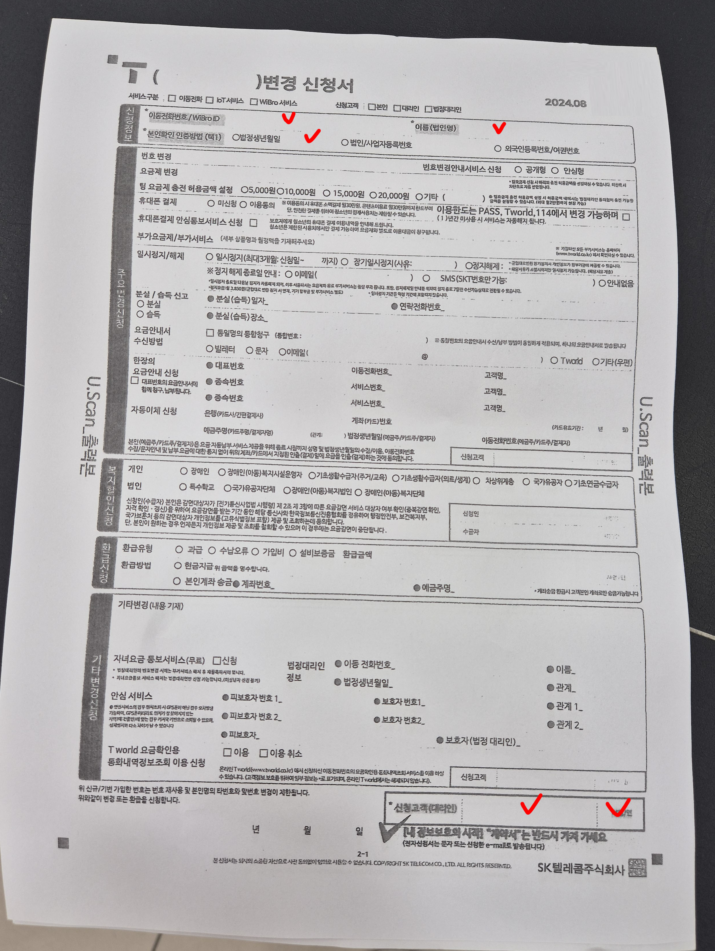 명단 작성을 완료하면 아래 사진과 같은 변경 신청서를 받게 되며, 신청서에는 이동전화번호, 이름, 법정생년월일, 서명 기재가 필요합니다. 이후 본인 차례가 오면 신분증과 예약 확인 문자를 제시하고, 직원의 확인을 거쳐 유심칩을 교체합니다.