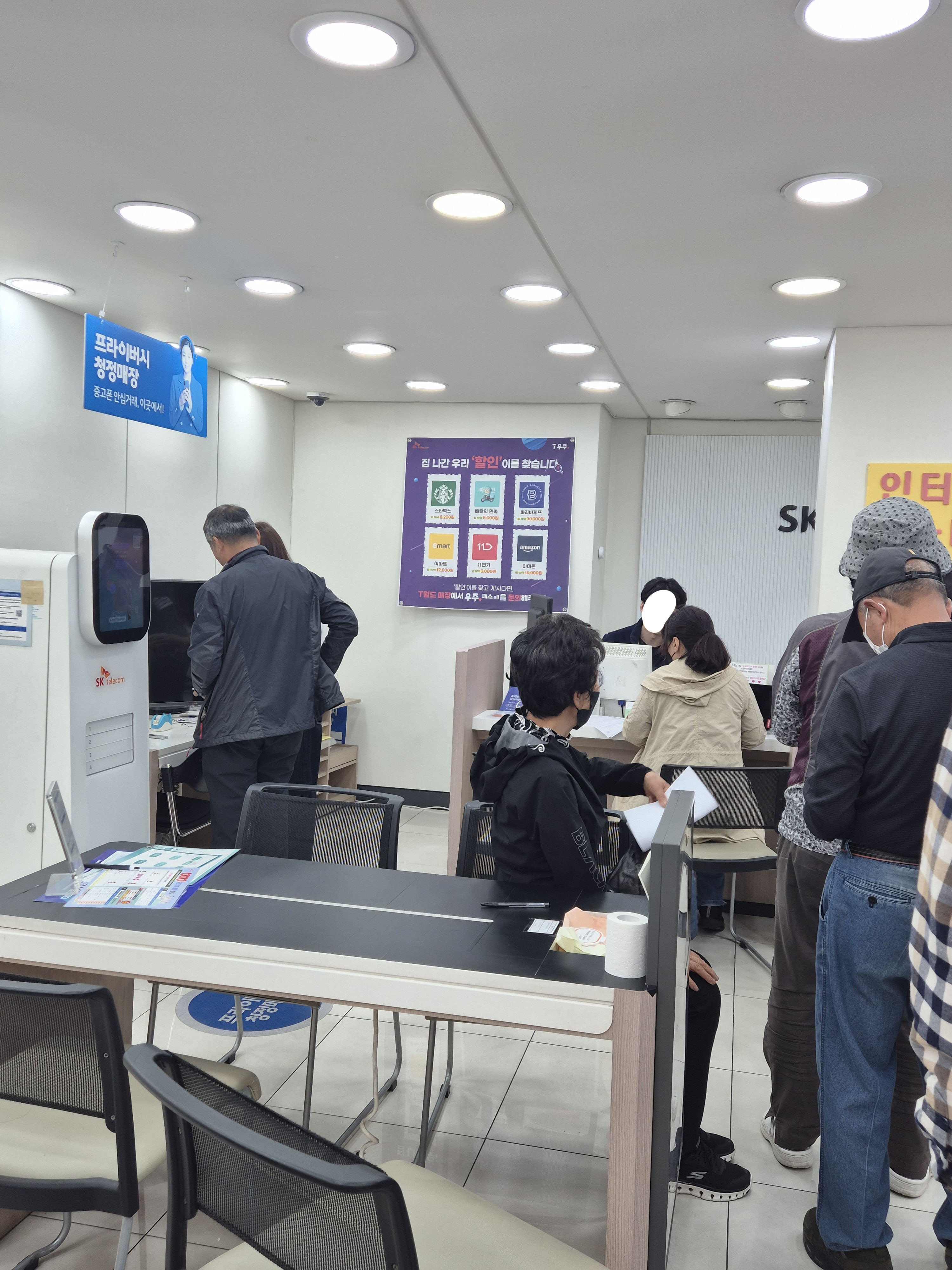 대기줄 맨 앞에 있는 SKT 직원이 들고 있는 명단에 직접 이름과 전화번호를 작성합니다. (이때, 가족 구성원도 SKT 이용자라면 함께 작성 가능. 예: 010-0000-0000(딸), 010-0000-0000(엄마))